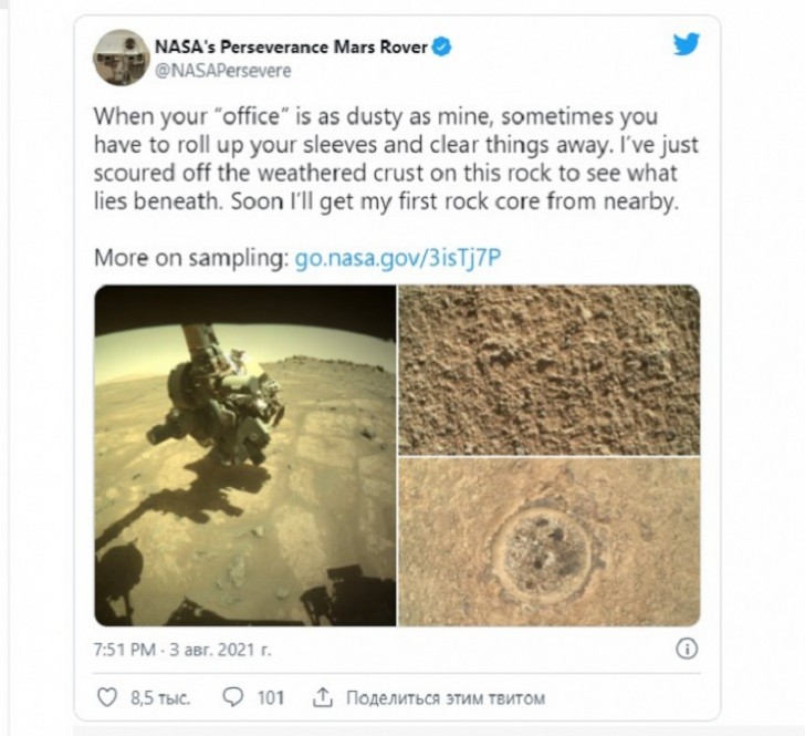 Kosmik robot "qırmızı planet"də torpaq nümunələri toplayarkən Marsın yeni fotoşəkillərini çəkib. Fotolar NASA-nın "Tvitter" səhifəsində yayımlanıb. Qeyd olunur ki, yaxın vaxtlarda aparat Marsda ilk torpaq nümunələrini toplayacaq.