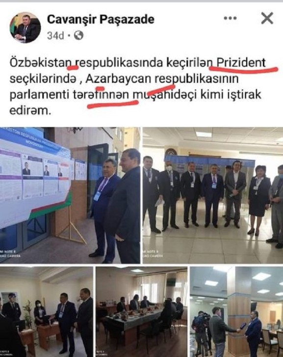 “Özbəkistan respublikasında keçirilən Prizident seçkilərində , Azarbaycan respublikasının parlamenti tərəfinnən muşahidəçi kimi iştirak edirəm”. (Oxu.az)