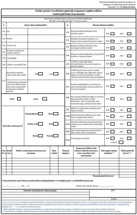 Nazirlər Kabinetinin Qərarı ilə təsdiq edilmiş "Rezidentlər və qeyri-rezidentlər tərəfindən milli valyutanın nağd şəkildə və milli valyutada ifadə olunmuş qiymətli kağızların Azərbaycan Respublikasından çıxarılması və Azərbaycan Respublikasına gətirilməsi zamanı bəyan edilməsi Qaydası”na əsasən rezident və qeyri-rezident fiziki şəxslər 20 000 (iyirmi min) manat və ondan yuxarı məbləğdə olan nağd milli valyutanı (kağız və metal pul nişanları) və milli valyutada ifadə olunmuş qiymətli kağızları gömrük orqanlarına yazılı formada tam məbləğdə bəyan etməklə gömrük sərhədindən keçirə bilərlər.