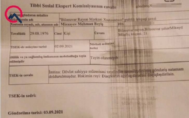 Şikayətlə bağlı Dövlət Tibbi Sosial Ekspertiza və Reabilitasiya Agentliyinə müraciət etdik. Agentliyin İctimaiyyətlə əlaqələr şöbəsinin müdiri Tural Qurbanov “Qafqazinfo”ya Mehman Mirzəyevin müraciətinin tibb müəsissəsi tərəfindən göndərilən göndəriş əsasında qiymətləndirildiyini bildirdi: “Göndərişdə qeyd edilən soltərəfli nefrektamiya diaqnozu üzrə əlillik təyinatının aparılması qanunvericilikdə nəzərdə tutulmayıb. Ona görə də M.Mirzəyevə əlillik təyin edilməsindən imtina qərarı verilib. Digər böyrəyinin funksional vəziyyəti də nəzərə alınmaqla əlilliyinin qiymətləndirilməsi üçün isə o, yenidən tibb müəssisəsinə müraciət etməli, həmin böyrəyin ağırlıq dərəcəsinin müəyyənləşdirilməsi də diaqnoza əlavə edilməklə e-sistemə yeni göndəriş daxil edilməlidir. Bu barədə ona məlumat verilib”.