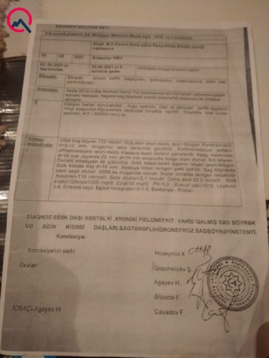 “Bir böyrəyimi illər əvvəl aldığım travma nəticəsində kəsib götürüblər. O biri də qüsurludur, daş karxanasını xatırladır. 3 ildir stent qoyulub, amma imkansızlıqdan müalicə etdirə bilmirəm. Səhhətimdə ciddi ağrılar var. Bu vəziyyətdə II qrup əlil kimi aldığım pensiyanı da kəsiblər”.
