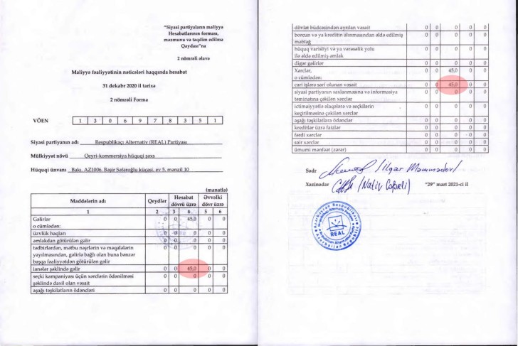 Nümunə üçün, sosial şəbəkələrdə aktiv olan iki müxalifət partiyasının sonuncu maliyyə hesabatını paylaşıram. Hər iki partiyanın ofisi də var, fəaliyyəti də. AĞ Partiyanın hesabatında il ərzində 0 manat, REAL Partiyasında isə cəmi 45 manat gəlir və xərci olduğu yazılıb.