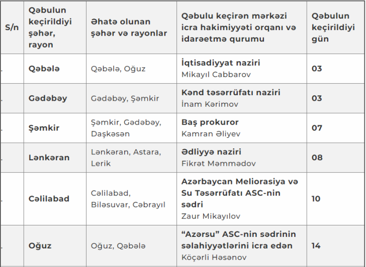Mərkəzi icra hakimiyyəti orqanlarının və digər idarəetmə qurumlarının rəhbərləri tərəfindən 2022-ci ilin iyun ayında şəhər və rayonlarda keçiriləcək vətəndaşların qəbulu cədvəli açıqlanıb.