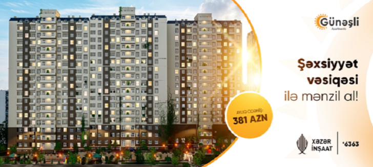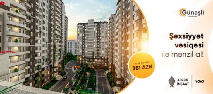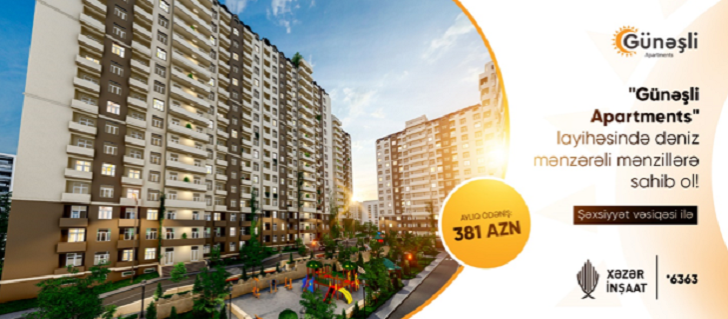 Xəzər İnşaat “Günəşli Apartments” layihəsində arayışsız və zaminsiz ŞƏXSİYYƏT VƏSİQƏSİ ilə AYLIQ 381 AZN-ə tam təmirli, dəniz mənzərəli mənzillər təklif edir! Şəhərimizin səfalı guşələrindən olan, havasının təmizliyi ilə seçilən Günəşli yaylasında tikilmiş “Günəşli Apartments” yaşayış kompleksində sizin və ailənizin komfortu üçün bütün imkanlar düşünülüb.