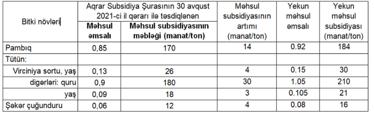 Aqrar Subsidiya Şurasının qərarına əsasən, 2022-ci ildə pambıq, tütün və şəkər çuğunduru üzrə məhsul subsidiyasının artımı və yekun məhsul subsidiyasının məbləği aşağıdakı kimi müəyyən olunub: