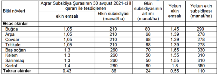 Aqrar Subsidiya Şurasının qərarına əsasən, 2022-ci ildə buğda, arpa, çovdar, tritikale, kartof, baş soğan, kələm, sarımsaq bitkilərinin əsas əkinlərinə, qarğıdalı, günəbaxan, soya, darı, sorqo və kartof bitkilərinin təkrar əkinlərinə görə verilən əkin subsidiyasının artımı və yekun əkin subsidiyasının məbləği aşağıdakı kimi müəyyən olunub: