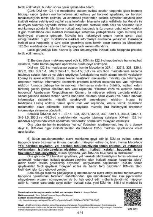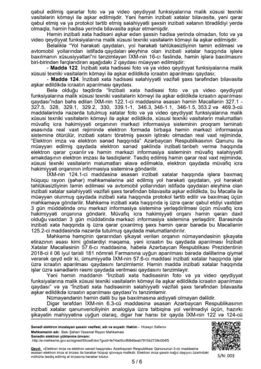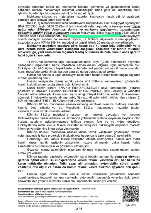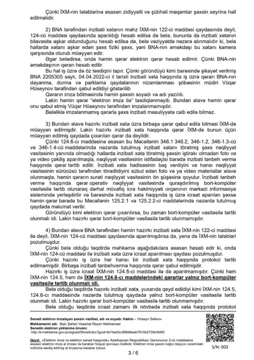 Yasamal rayon Məhkəməsinin hakimi Hüseyn Akif oğlu Səfərovun sədrliyi ilə keçirilən məhkəmədə BNA-nın yazdığı cərimələrin qanunsuz olduğu bildirilib və bu səbəbdən hakim həmin qərara xitam verərək sürücünün şikayətini təmin edib.