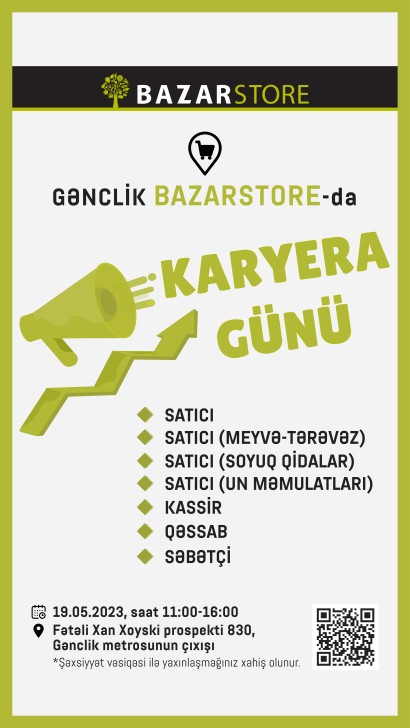 Mayın 19-da Gənclik metrosunun yaxınlığında yerləşən mağazada “Karyera günü” keçiriləcəkdir. “Karyera günü” çərçivəsində aşağıda qeyd olunan vakansiyalar üzrə müraciət edən namizədlərlə şirkətin İnsan Resursları Departamentinin nümayəndələri arasında birəbir görüş baş tutacaq.