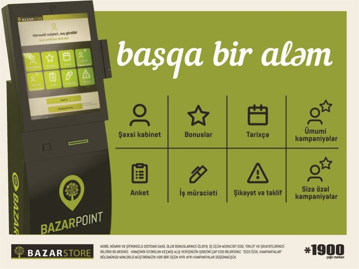 Hər zaman müştərilərinin rahatlığını və cibini düşünən Bazarstore daha bir yeniliyə imza atıb. Artıq marketlərdə müştərilərə aid bir dünya var. Bütün marketlərin girişində yerləşdirilən “BazarPoint” aparatlarındakı yeniliklər hər kəsin ürəyincə olacaq.