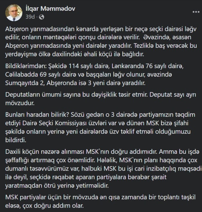 İlqar Məmmədovdan sensassion iddia: Bu seçki dairələri ləğv olunur