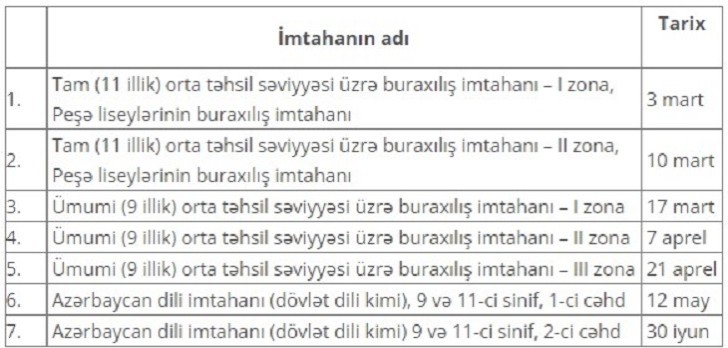 DİM-dən verilən məlumata görə, imtahan qrafiki Elm və Təhsil Nazirliyi ilə razılaşdırılıb. İmtahan iştirakçılarının nəzərinə çatdırırıq ki, ümumi (9 illik) və tam (11 illik) orta təhsil səviyyələri üzrə buraxılış imtahanı proqramları tədris ilinin əvvəlində – sentyabr ayında ictimaiyyətə təqdim olunub və Mərkəzin saytına yerləşdirilib.