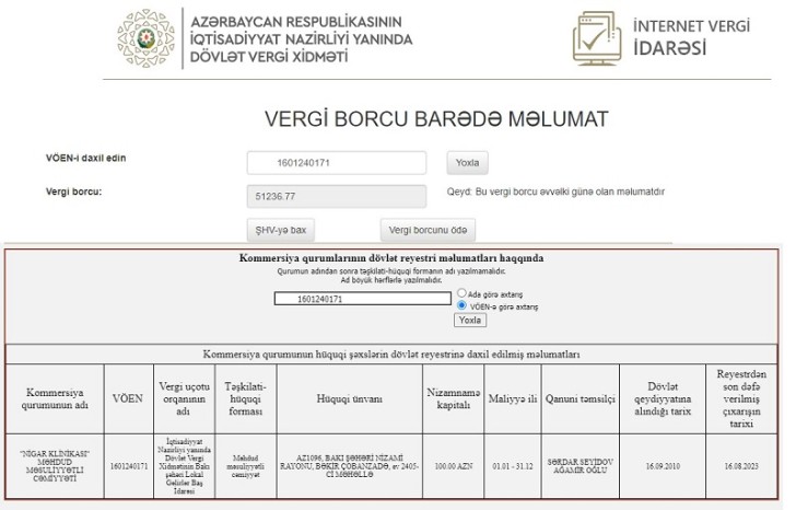 AFN.az-ın Qaynarinfo-ya istinadən məlumatına görə, qanuni təmsilçisi Sərdar Seyidov Ağamir oğlu olan, Çobanzadə küçəsi 24/05 ünvanında yerləşən "Nigar" klinikasının Bakı şəhəri Lokal Gəlirlər Baş İdarəsinə 51236.77 manat vergi borcu var. Klinikanın təsisçisi ixtisasca həkim olan iş adamı Şahbaz Şahbazovdur.