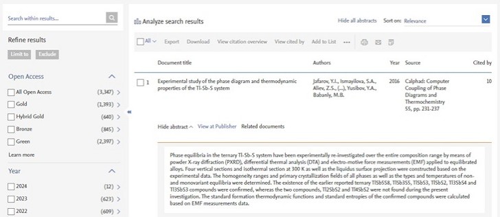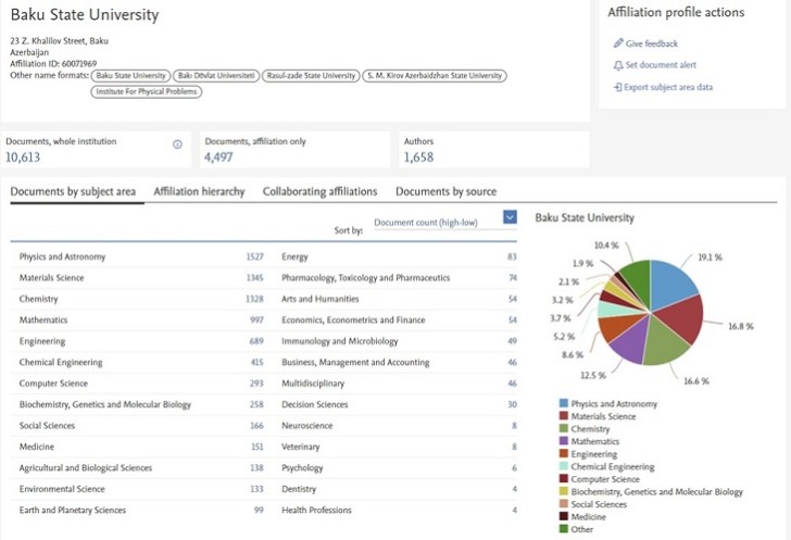 Fizika və astronomiya, kimya, riyaziyyat, materialşünaslıq, kompüter elmləri, tibb, biologiya, ekologiya, sosial elmlər, humanitar elmlər və elmin müxtəlif sahələrinin qovşağında olan multidissiplinar sahələr üzrə “Scopus” bazasına daxil olan dərgilərdə isə indiyə qədər ümumilikdə 10 613 elmi əsər dərc olunub. Fizika və astronomiya, materialşünaslıq, kimya və riyaziyyat üzrə dərc olunmuş məqalələrin sayı və onlara edilmiş istinadlar digər sahələrlə müqayisədə daha çoxdur.