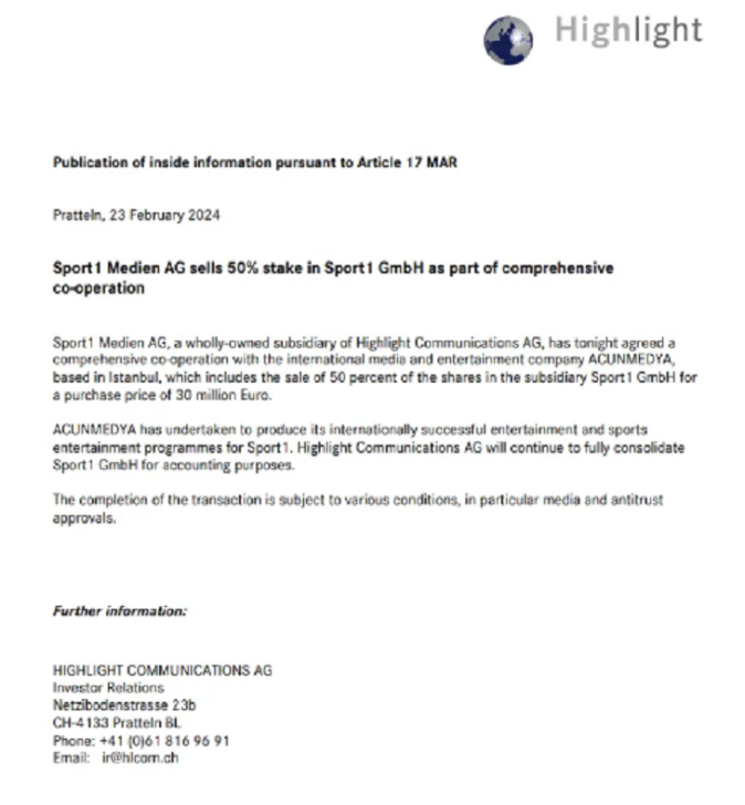 İsveçrənin “Highlight Communications” media qrupunun verdiyi rəsmi açıqlamada SPORT1 səhmlərinin 50 faizinin 30 milyon avroya ACUNMEDYA-ya satıldığı bildirilib.