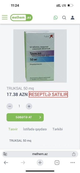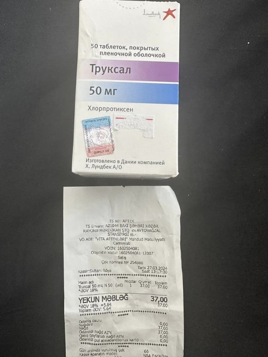 AFN.az xəbər verir ki, bu barədə sosial şəbəkələrdə tanınmış teleaparıcı Zamirə Dadaşova bildirib. O, "Truxal" adlı dərmanın Mərdəkanda yerləşən "Vita Aptek"dən 37 manata alındığını sübut edən fotolar paylaşıb.