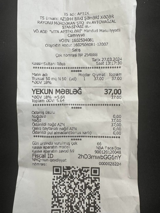 Z.Dadaşovanın paylaşdığı qəbzlərdən aydın olur ki, eyniadlı dərman eyni gündə başqa aptekdən 17.38 manata alınıb. "Truxal"ın Tarif Şurası tərəfindən təsdiqlənən qiyməti isə 15.71 manatdır.