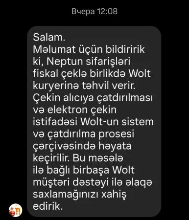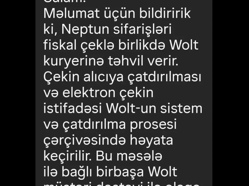 Qeyd edək ki, alıcı "Neptun" marketlər şəbəkəsinə yazaraq bu barədə məlumat verib. Ona bildirilib ki, mağaza qəbzi sifarişlərlə birgə kuryerə təqdim edir: "Bu məsələ ilə bağlı birbaşa 'Wolt' müştəri dəstəyi xidməti ilə əlaqə saxlamağınız xahiş olunur".