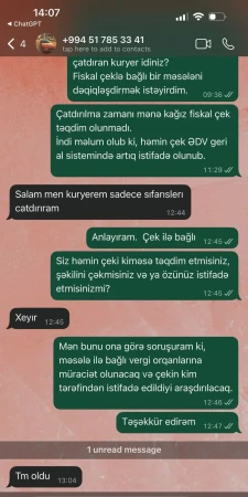 AFN.az xəbər verir ki, bu barədə Leyli Axundova adlı alıcı sosial şəbəkədə yazıb. O qeyd edib ki, mağazadan 50 manat məbləğində alış edib. Sifariş zamanı fiskal çek təqdim edilməyib: "Sonradan elektron fiskal çek göndərilsə də, ƏDV geri al sistemində yoxlama zamanı çekin artıq başqa istifadəçi tərəfindən istifadə edildiyi məlum oldu. Bu səbəbdən mən ƏDV geri al hüququmdan istifadə edə bilmirəm. Hesab edirəm ki, bu hal fiskal uçot qaydalarının pozulmasıdır və alıcının hüquqlarını məhdudlaşdırır. 'Wolt'la sifariş çatdırılanda qəbzi tələb edin, ya da kuryerin yanında yoxlayın".