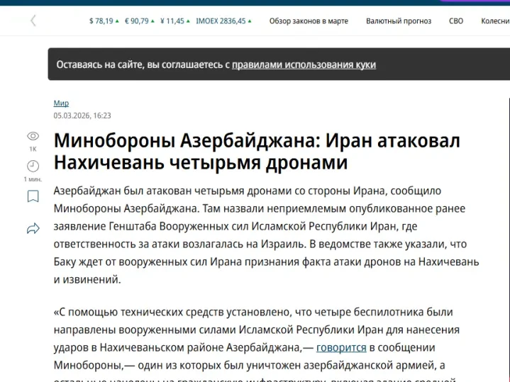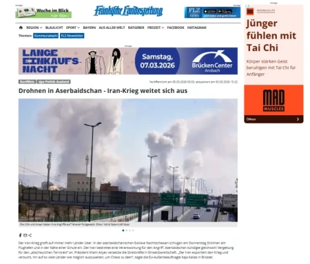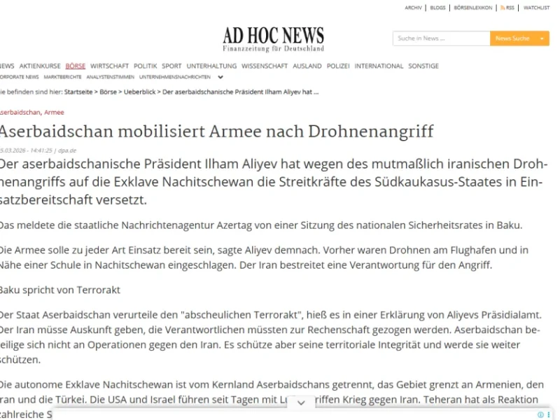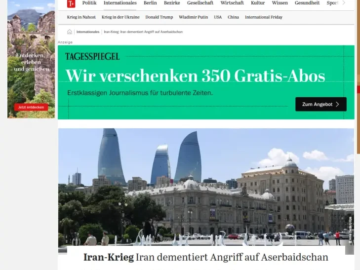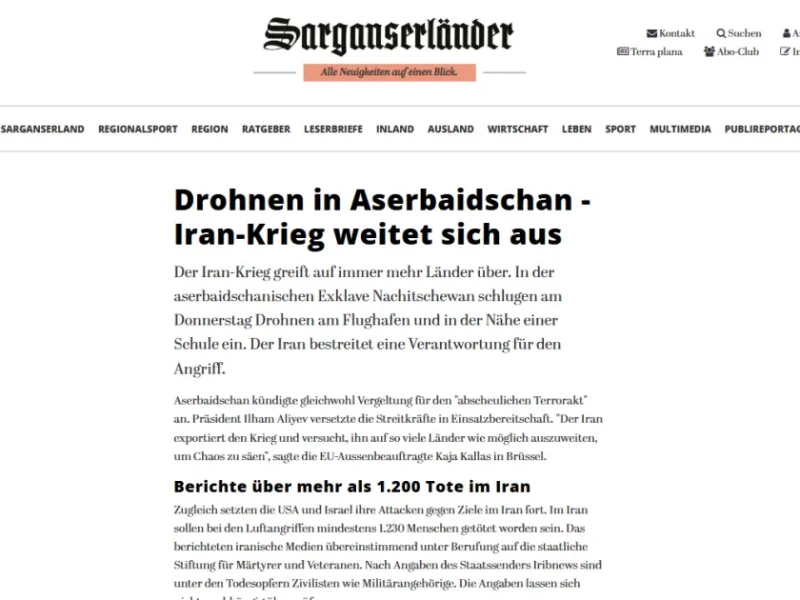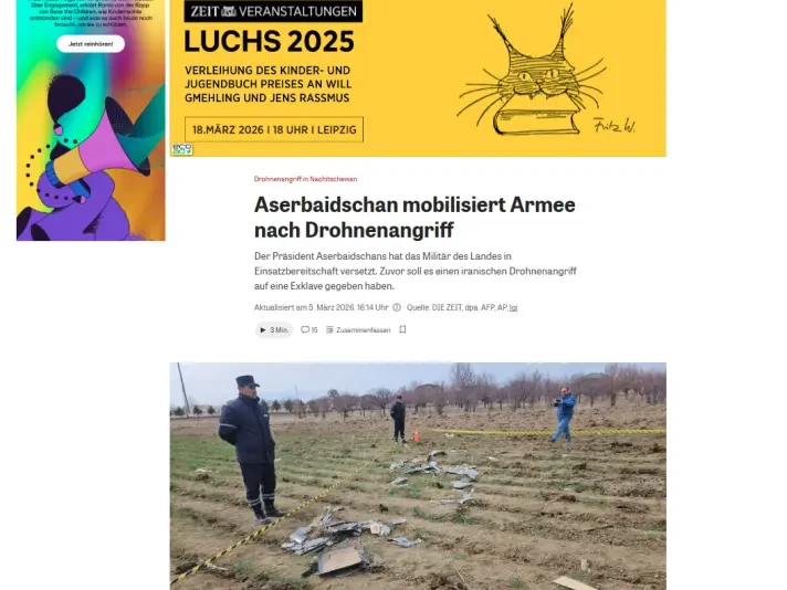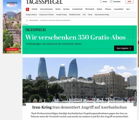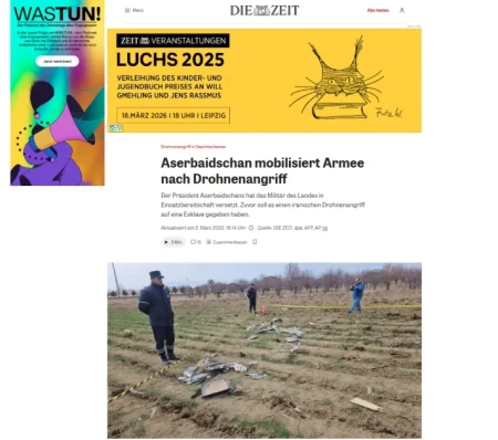 “Morgenpost”, “Börsen News”, “Tagesspiegel” və digər alman nəşrlərinin materiallarında Naxçıvanda aeroportun, məktəb binasının və digər mülki obyektlərin dron hücumuna məruz qaldığı diqqətə çatdırılıb. Azərbaycan lideri İranın hücumunu “terror aktı” adlandırıb və onun göstərişi ilə Azərbaycan Silahlı Qüvvələri yüksək döyüş hazırlığına gətirilib.