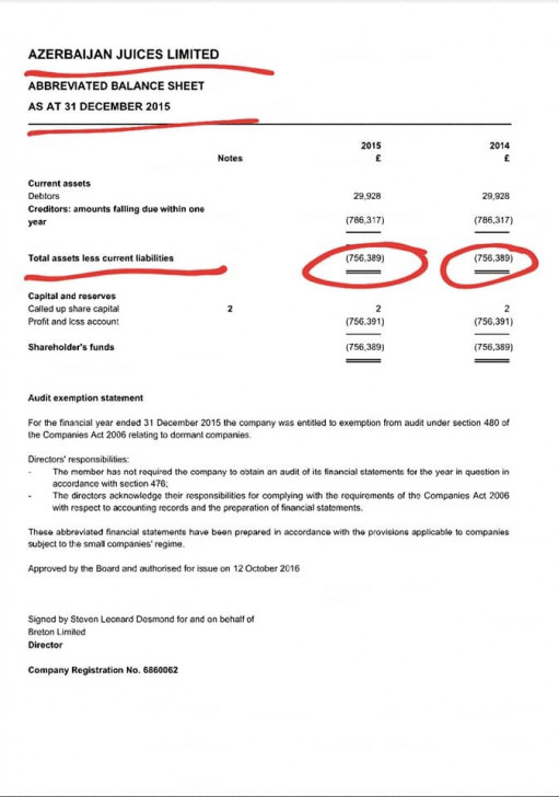 AZERBAIJAN JUICES LIMITED şirkətinin aktivləri isə bundan bir qədər artıqdır. 2015-ci ilin tədiyyə balansına görə 800 min funt sterlinqdən bir qədər artıq. Sənədlərə görə Taleh və Nicat Heydərovların yaşadıqları ünvan 13 Albert Hall Mansions, Kensington Gore, London olaraq göstərilir. Bu ünvanda 4 otaqlı evlərin qiyməti 6,5-7 milyon funt sterlinqdən başlayır.