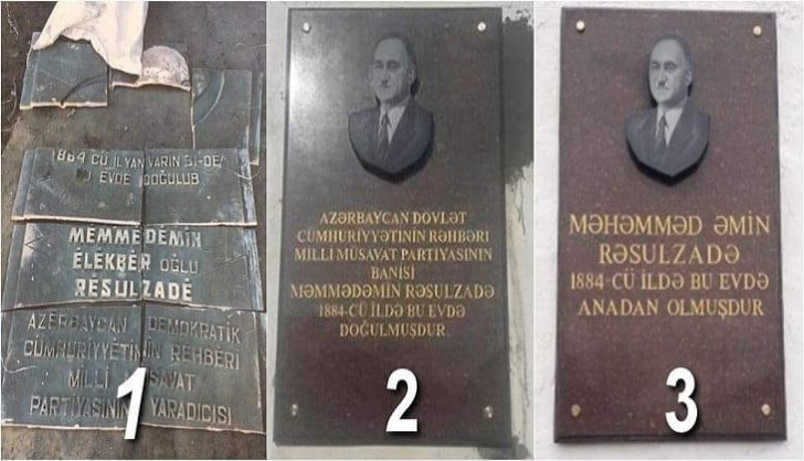 Mətləbdən çox da uzaqlaşmayaq. İkinci barelyef ciddi narazılıq doğurduğundan, Abşeron və Novxanı başbilənləri bu gün onu yenisi ilə əvəzləyiblər. Bu dəfə özlərinə çox əziyyət verməyiblər:"Məhəmməd Əmin Rəsulzadə 1884-cü ildə bu evdə anadan olmuşdur”.