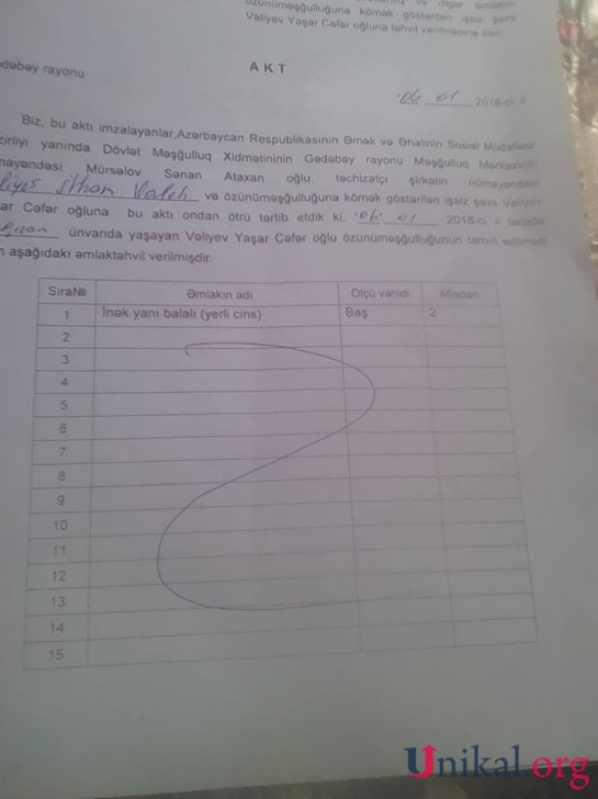 Bu barədə Unikal.org-a müraciət edən Gədəbəy rayon Arıqıran kənd sakini Yaşar Vəliyev ona sənədlərdə qeyd edilən kimi heyvanlar verilmədiyini iddia edir.O, bildirir ki, sənədlərdə heyvanların qiymətləri də şişirdilib: