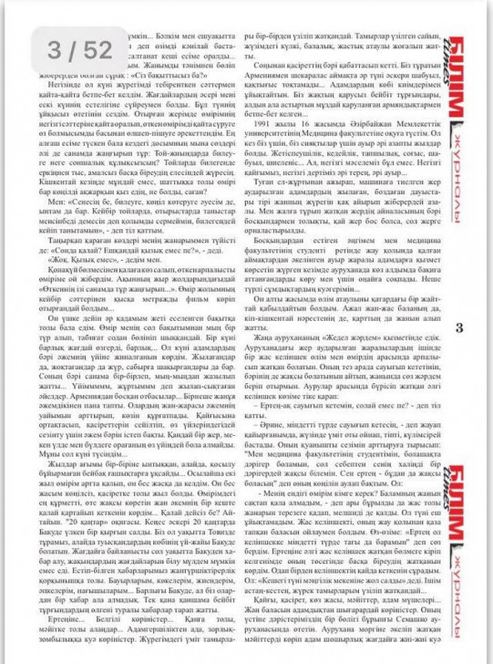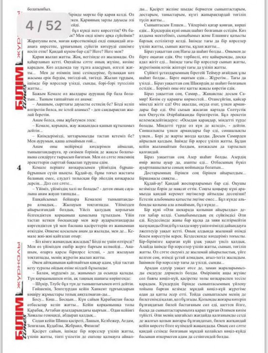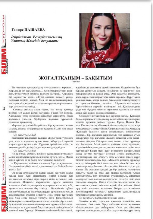 Üz qabığnda Qənirə Paşayevanın şəklini verən Qazaxıstanın “Bilim Tayms” jurnalının “baş yazı” yerində millət vəkilinin Qarabağ mövzusunda qələm aldığı “İtirdiyim xoşbəxtlik” hekayəsinin qazaxcaya uyğunlaşdırması verilib. Hekayəni istedadlı qazax gənc ədibi Erkin-bek Serikbay uyğunlaşdırıb.