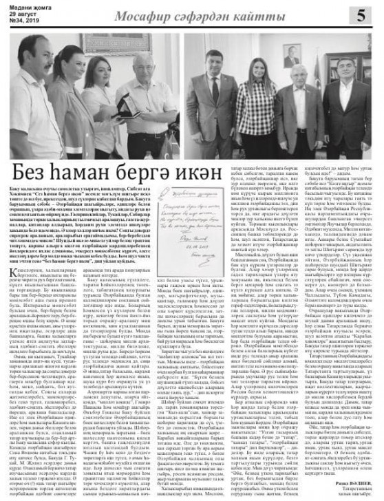Avqustda millət vəkili Q.Paşayevanın dəvəti ilə Azərbaycanda səfərdə olmuş Tatarıstanın Xalq şairi, millət vəkili, Dövlət Mükafatı laureatı Razil Vəliyev aparıcı tatar media orqanlarında yer alan müsahibə və məqalələrində Azərbaycanla bağlı zəngin təəssüratlarını ifadə edib.