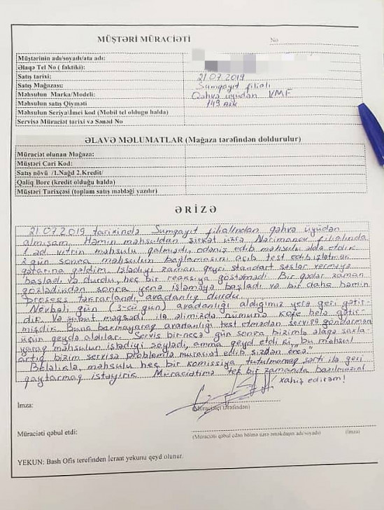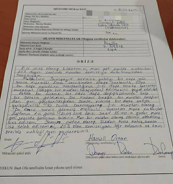 O daha sonra bildirib ki, məhsul servisə göndərilib və orada əvvəldən qeydiyyatda olduğu aşkarlanıb. Məhsulun geri qaytarılması zamanı isə 40% kəsinti təklif olunub. Uzun mübahisədən sonra bu rəqəm 25%-ə endirilsə də, müştəri bu şərtlə razılaşmayıb və baş ofisə rəsmi şikayət ərizəsi ilə müraciət edib.