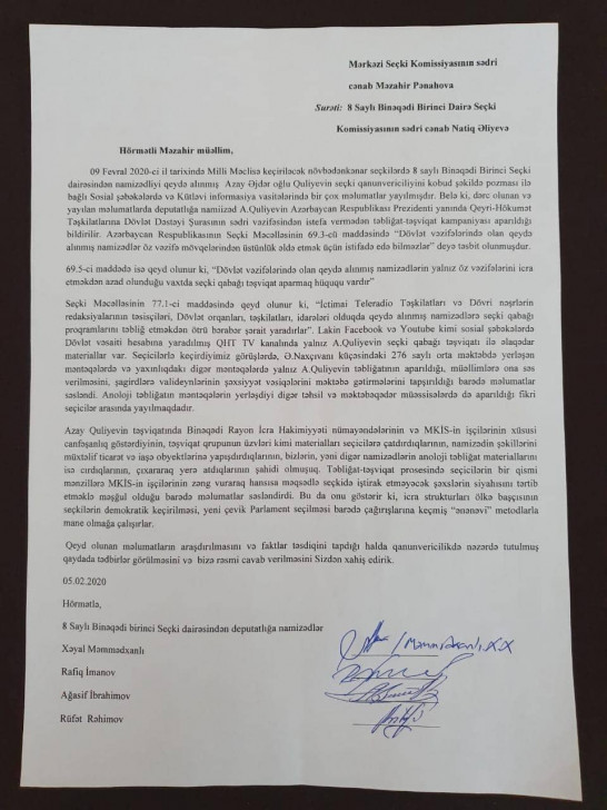 8 Saylı Binəqədi Birinci Seçki Dairəsindən Milli Məclisə keçiriləcək növbədənkənar seçkilərə namizədliyini irəli sürmüş bir neçə səxs MSK sədri Məzahir Panahova Azay Quliyevin qanunazidd əməlləri ilə bağlı şikayət müraciət edib.