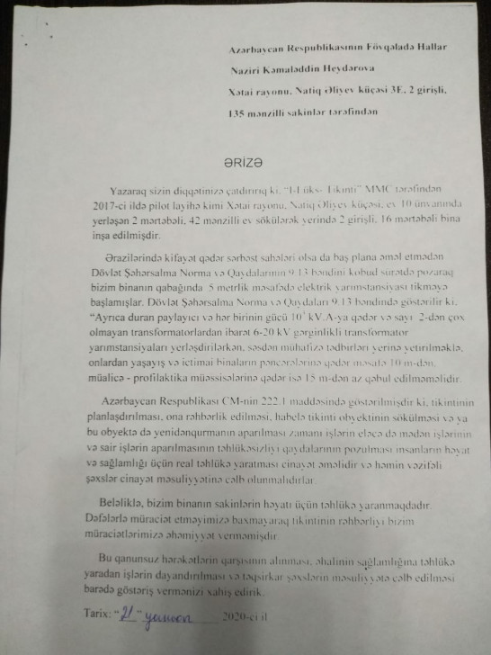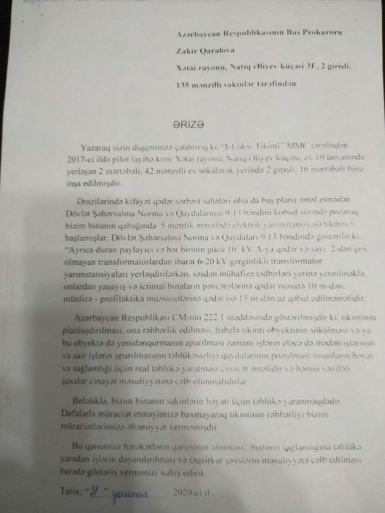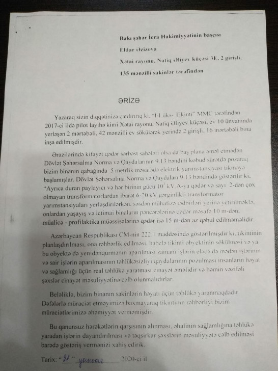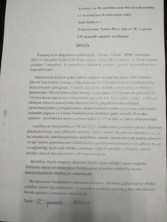 Binanın sakinləri qanunsuz hərəkətlərin qarşısının alınması, əhalinin sağlamlığına təhlükə yaradan işlərin dayandırılması və təqsirkar şəxslərin məsuliyyətə cəlb edilməsini barədə aidiyyatı qurumların göstəriş vermələrini xahiş edirlər.
