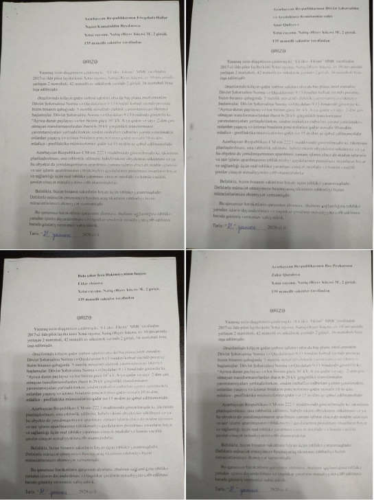 Sakinlər qeyd ediblər ki, yaşadıqları ərazidə kifayət qədər sərbəst sahələri olsa da, baş plana əməl etmədən Dövlət Şəhərsalma norma və qaydaların 9.13 bəndini kobud sürətdə pozaraq onların binalarının qabağında 5 metrlik məsafədə elektrik yarımstansiyası tikməyə başlanılıb: “Halbuki həmin qaydaların müvafiq bəndində göstərilir ki, ayrıca duran paylayıcı və hər birinin gücü 10 kubmetr kV.A-da qədər və sayı 2-dən çox olmayan transformatorlardan ibarət 6-20 kV gərginlikli transformator yarımstansiyaları yerləşdirilərkən, səsdən mühafizə tədbirləri yerinə yetirilməklə, onlardan yaşayış və ictimai binaların pəncərələrinə qədər məsafə 10 metrdən, müalicə-profilaktika müəssisələrinə qədər isə 15 metrdən az qəbul edilməməlidir”.