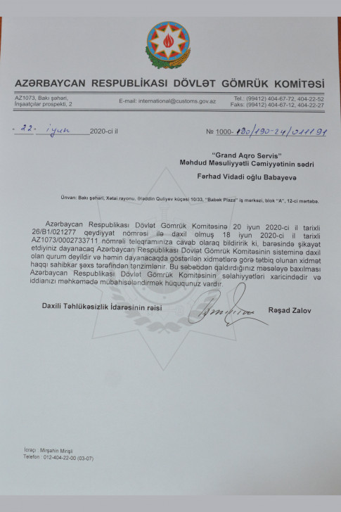 Məsələ ilə bağlı gömrük orqanlarına edilən müraciətlərin cavabsız qalması barədə deyilənlər isə həqiqətə uyğun deyil. Belə ki, "Grant Aqro Servis" MMC-nin rəhbəri Babayev Fərhad Vidadi oğlu adından Dövlət Gömrük Komitəsinin Çağrı Mərkəzinə, ümumiyyətlə müraciət olunmayıb. Həmin şəxsin imzası ilə 20 iyun 2020-ci il tarixdə Dövlət Gömrük Komitəsinə daxil olan teleqram isə Komitənin aidiyyəti qurumları tərəfindən 22 iyun 2020-ci il tarixdə cavablandırılıb və məktubda qaldırılan məsələnin Komitənin səlahiyyətlərinə aid olmadığı bildirilib. Üstəlik həmin şəxsə məsələyə hüquqi qiymət verilməsi üçün aiddiyəti qurumlara müraciət etmək də tövsiyə olunub.