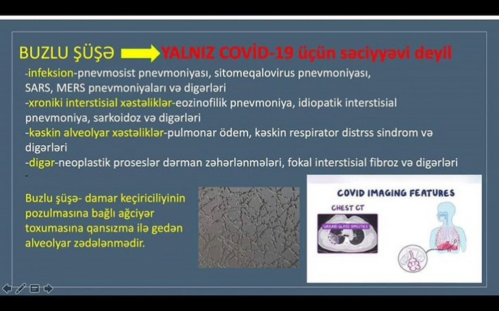 Radioloq M.Sultanova deyir ki, indi onlara ən çox verilən sual “buzlu şüşə” görüntüsünün indiyədək mövcud olub-olmaması ilə bağlıdır. Həkim qeyd edir ki, bu, yalnız COVID-19 xəstələri üçün səciyyəvi deyil, digər xəstəliklərdə də görülə bilər. Lakin bu görüntü pandemiya dönəmində uyğun kliniki-laborator əlamətlərlə izlənilərsə, onda diaqnoz COVID xəstəliyi kimi dəyərləndirilir.