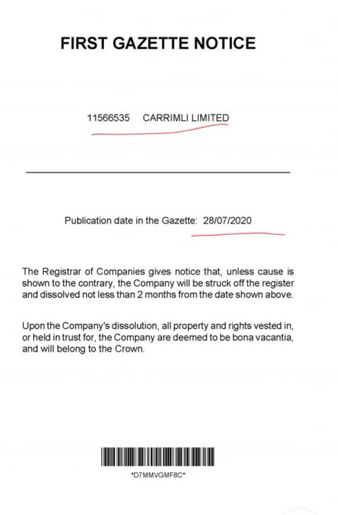 Bununla bağlı o, iyulun 17-də Londonda Şirkətlər Evinə (müəssisələrin qeydiyyat idarəsi) müraciət edib. Şirkətin ləğvi barədə məlumat iyulun 28-də rəsmi qəzetdə dərc olunacaq.