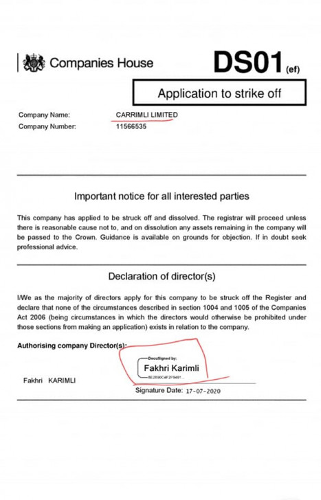 Milli Məclisin deputatı Azər Kərimlimin oğlu Fəxri Kərimli iki il əvvəl İngiltərədə təsis etdiyi "CARRIMLI LIMITED" şirkətini könüllü şəkildə ləğv edib.
