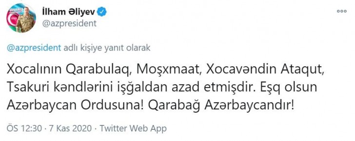 "Müzəffər Azərbaycan Ordusu Füzulinin Yuxarı Veysəlli, Yuxarı Seyidəhmədli, Qorqan, Üçüncü Mahmudlu, Qacar, Divanalılar, Cəbrayılın Yuxarı Məzrə, Yanarhac, Qubadlının Qəzyan, Balasoltanlı, Mərdanlı, Zəngilanın Beşdəli, Xocalının Qarabulaq, Moşxmaat, Xocavəndin Ataqut, Tsakuri kəndlərini işğaldan azad etmişdir. Eşq olsun Azərbaycan Ordusuna! Qarabağ Azərbaycandır!”.
