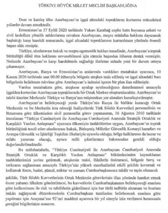 AFN “Anadolu”ya istinadən xəbər verir ki, bu, Türkiyənin Azərbaycana hərbi qüvvələr göndərməsi ilə bağlı qanun layihəsində əksini tapıb.