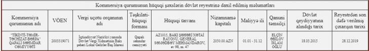Adından və qalib olduğu tenderlərdən göründüyü kimi bütün profillərdə fəaliyyət göstərən "Tikinti-Təmir-Təchizat-Bərpa” QSC-nin nizamnamə kapitalı 2050 manatdır. Şirkət 2015-ci ilin mart ayının 18-də dövlət qeydiyyatına alınıb. Şirkətin hüquqi ünvanı General Səmədbəy Mehmandarov, ev 98, mənzil 47, qanuni təmsilçisinin isə Əbilov Elçin İslam oğlu göstərilib.
